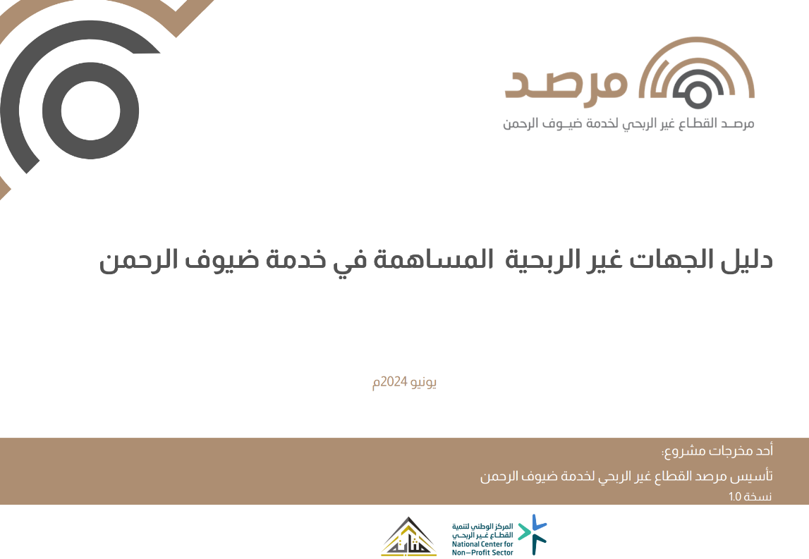 يهدف الدليل إلى التعريف بالمنظمات غير الربحية المشاركة في خدمة ضيوف الرحمن، وإبراز الخدمات التي ساهمت بها كل منظمة في خدمة ضيوف الرحمن. ويتكون من المقدمة، والمنهجية والملخص التنفيذي، بالإضافة لقائمة المنظمات المساهمة في خدمة ضيوف الرحمن خلال فترة التقرير، وتشمل الجمعيات الأهلية والمؤسسات الأهلية والأوقاف، ومن ثم يتناول الدليل بيانات الجهات المساهمة في خدمة ضيوف الرحمن خلال فترة التقرير.